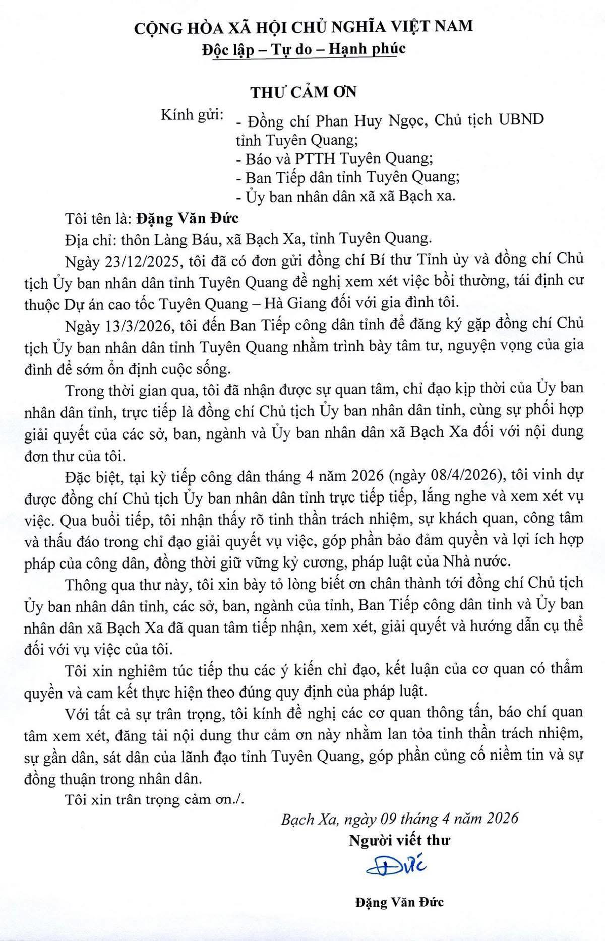 Công dân Đặng Văn Đức đánh giá, buổi tiếp công dân thể hiện tinh thần trách nhiệm, sự khách quan, công tâm và thấu đáo trong chỉ đạo giải quyết vụ việc, góp phần bảo đảm quyền và lợi ích hợp pháp của công dân, đồng thời giữ vững kỷ cương, pháp luật của Nhà nước. Cổng Thông tin điện tử tỉnh đăng tải Thư cảm ơn của công dân.