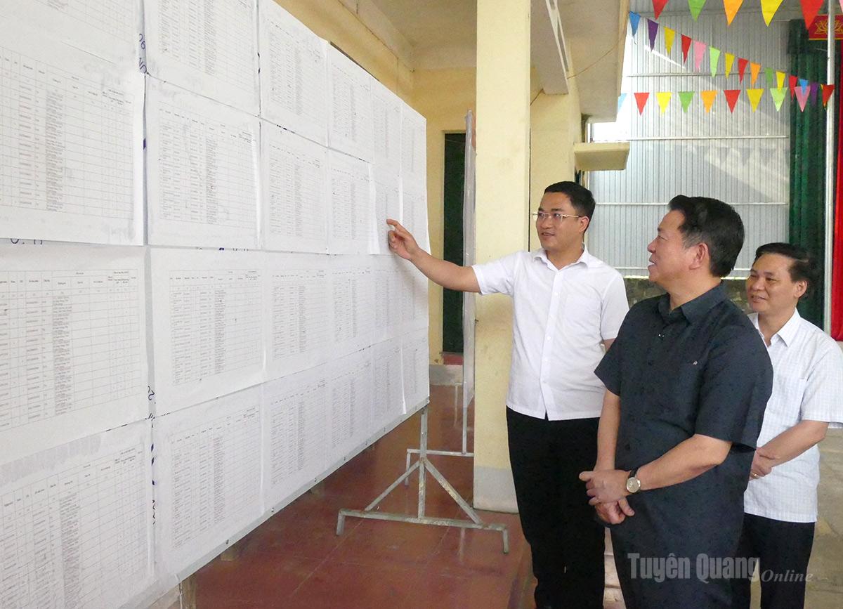 Đồng chí Trần Mạnh Lợi, Ủy viên BTV Tỉnh ủy, Trưởng ban Tuyên giáo và Dân vận Tỉnh ủy kiểm tra công tác chuẩn bị bầu cử tại xã Xuân Giang.