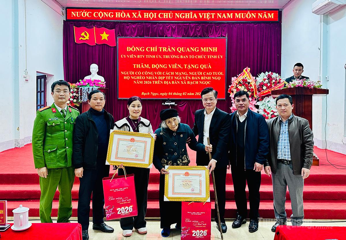 Chiều 4/2, đồng chí Trần Quang Minh, Ủy viên Ban Thường vụ Tỉnh ủy, Trưởng ban Tổ chức Tỉnh ủy đến thăm và trao 14 suất quà cho các gia đình người có công với cách mạng, người cao tuổi và hộ nghèo trên địa bàn xã Bạch Ngọc nhân dịp Tết Nguyên đán Bính Ngọ năm 2026.
